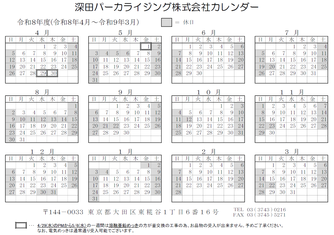 2026年4月~2027年3月までの深田パーカライジングのカレンダーが載ったパンフレットです。